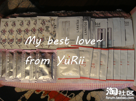 专柜送的精华小样:ANNASUI,瓶子好看~兰芝:效果有一点,DIOR,无论如何,别人送了,不要白不要,哈哈~兰蔻的精华小样,这3个都是比较有用的,留着出门的时候用~雅诗兰黛的精华:没有想象中的好用,失望,娇兰的精华:妆前精华一点都不好用,还揉得我累死了~~梦妆的精华:还不错,挺补水的~