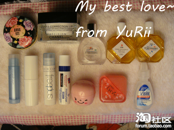 唇膏眼药水类:ANNASUI的铁罐唇膏:香味很好,可是我总觉得会浮在嘴巴上,不是很爽~香奈儿的修护唇膏,能修护唇吻和减少法令纹,很爱笑的我当然要必备啦~大约550块~曼秀雷敦的唇膏:性价比很高,不过我老是会丢,因为太多人用了~~FREEPLIS的护唇膏,日本的牌子,很好用很好用,很轻薄,但是又很滋润,85块~