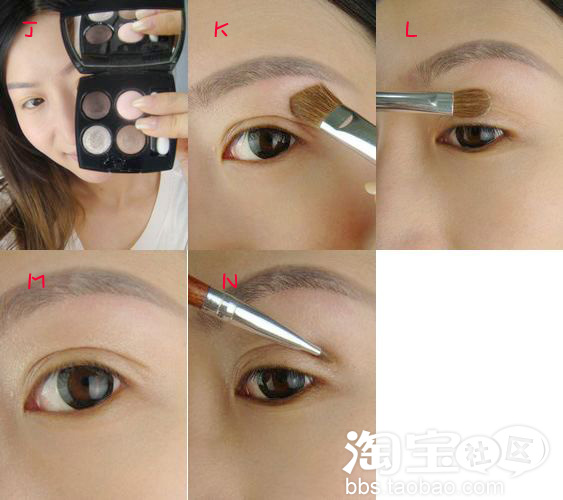 L、用眼影盘里左下方的灰色,在双眼皮褶子附近淡淡地来回横扫几下~