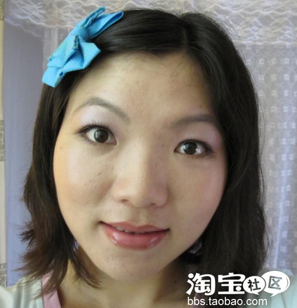 接下来就是我最怕的眼妆了,因为是内双,眼皮太厚怎么化眼皮都掉下来遮住了,包括贴了双眼皮贴的效果也还是一样,只有瞪眼的时候就看的到原来我的双眼皮也挺大挺有线条的哦。我化妆从来不化眼睛的,眼睛不好看,还不好化又带眼镜,所以一直被我省去了,今天是分享菜鸟经验来了,不化眼睛对不起观众了,呵呵。