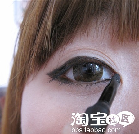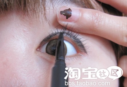 先用眼线膏画出眼睛的上轮廓,眼线膏是MM很喜欢的,因为夏天到了,眼线笔容易晕,而眼线膏却很好用。