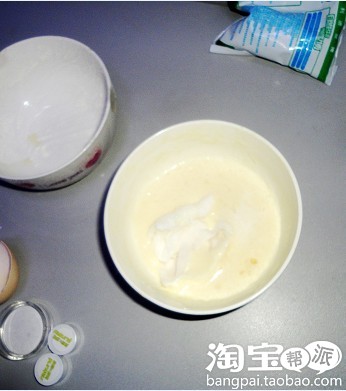 打开一个鸡蛋,将鸡蛋清拿出放入碗内,加入适量面粉,成稀稀的糊状,再加少许牛奶,最后再加入一滴VE,将面模糊搅匀。
