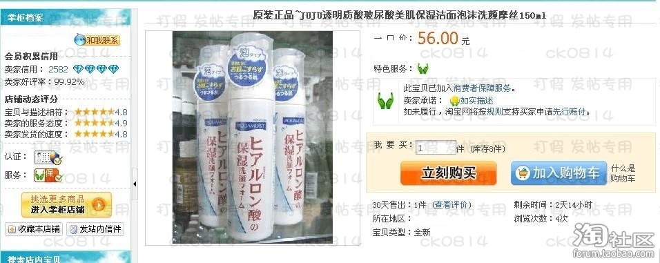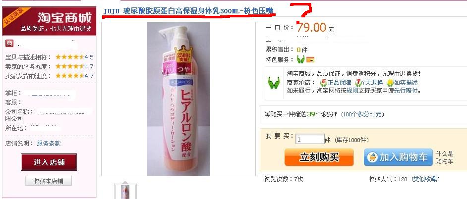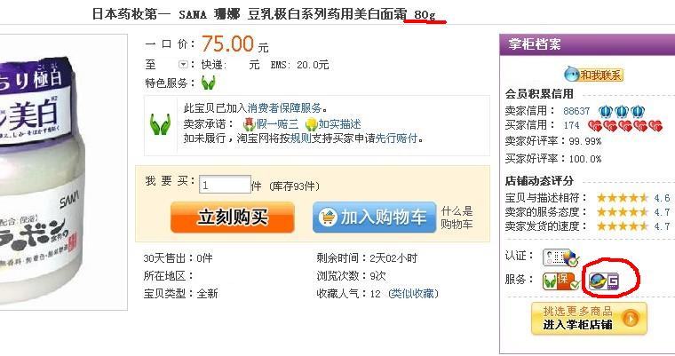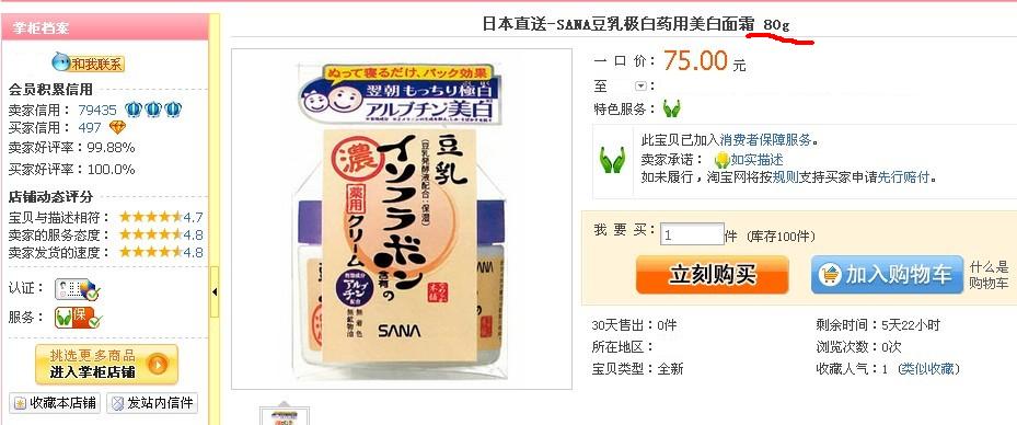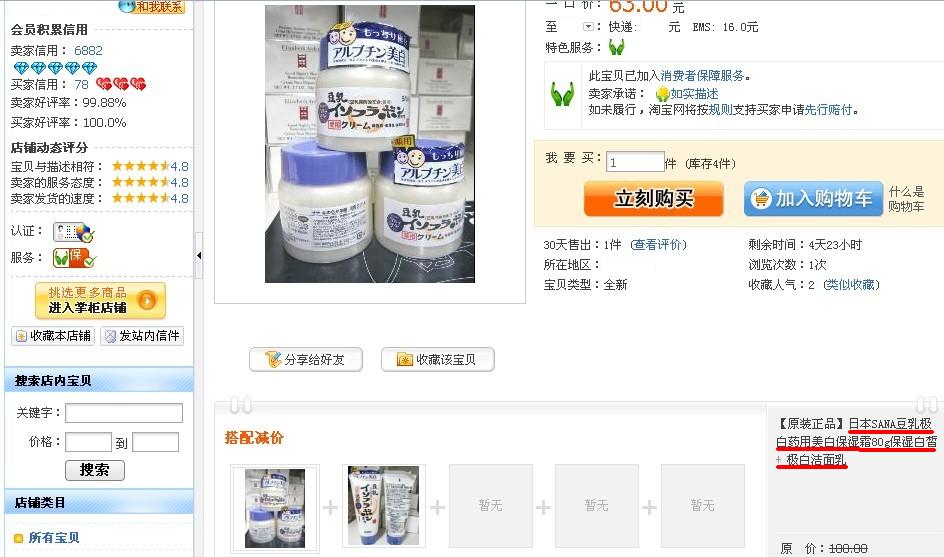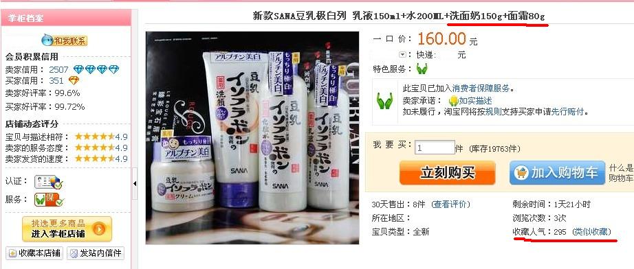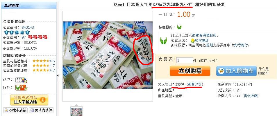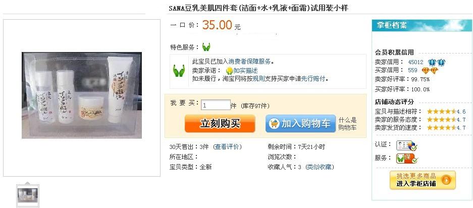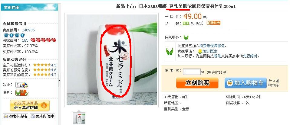 好了,说了会【高信誉度】,我们来说说【真假掺卖】的问题。化妆品、护肤品是JM们最怕的网购产品类别之一,因为假货、山寨货太多太多。但是网购价格又非常吸引人,这也是个让MM头疼的问题。举个例子,Armani阿玛尼的眼影35元,日本DHC深层卸妆油20元,这些有可能是真品么?现在淘宝上日韩的护肤品、彩妆假货泛滥情况比较严重,因为日韩的护肤品性价比高,在本土和其他地方都非常有人气。热卖的产品就会跟着一大堆假货、山寨货了。假的最猖狂的韩系护肤品THE FACE SHOP/DODO,日系护肤品SANA/JUJU等。KANEBO嘉娜宝官方曾出面澄清过:KANEBO根本没有出过所谓的“豆乳”系列!究竟要低价还是正品,各位MM还是要慎重考虑一下!不要为了一点小便宜而去买假货,去买所谓的“最新产品”(这里指官方产品库中没有出现的产品,俗称自创系列)。大多数淘宝店都加入了“消费者保护协会”,其实这个作用不是很大。真假掺卖,你能拿这些卖家怎么着?你要怎么证明他们卖的是假货呢?卖家会以“专柜验货”为由,让您自己去专柜检验真伪。这个方法可行么?JUJU在上海还有个专柜,那SANA呢?去哪里找专柜?难道去找所谓的MISS FACE专柜?(再次说明!MISS FACE和SANA、JUJU都没有关系!完全是雷人的山寨品!只有想不到,没有做不到的山寨品!我不敢说MISS FACE是假货,它可以是一个广州生产的独立的牌子,但千万别忽悠买家说是日本SANA的国内版)就只能去香港、澳门买一瓶正的回家自己来对比了。