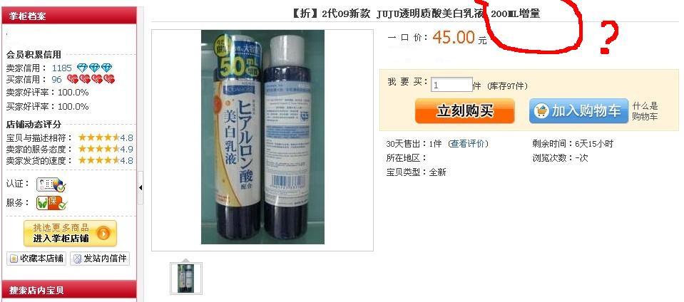 JUJU在09年8月24日推出JUJU高保湿玻尿酸/透明质酸滋润保湿乳液、胶原蛋白高保湿乳液新品。之前也预料到会出150ml装..逛逛淘宝上面.竟然意外发现有200ml装的山寨“新品”!见下图,都是说比普通版增量50ml..真的什么都想得出!