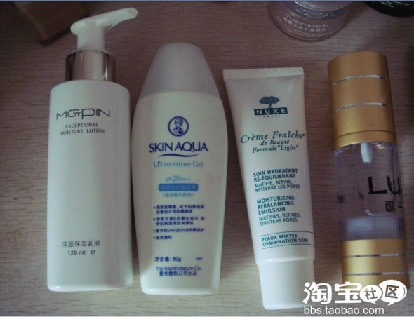 左三,nuxe鲜奶乳液。这个是乳状的,但是擦到脸上就变成水质的。味道是很纯朴的植物草根味,效果嘛,个人觉得不如碧欧泉的保湿霜~