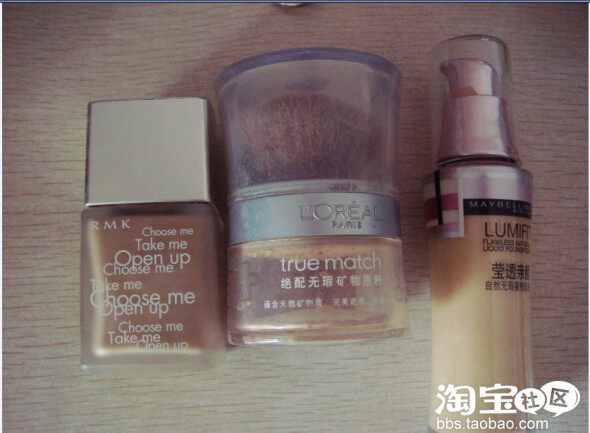 左三是美宝莲的莹润粉底液。这个粉底液。。。是我买杂志送的。。很大方的杂志啊,售价才10块而已。。。哈哈。还不错,至少用起来不卡不浮,妆感又有点的。
