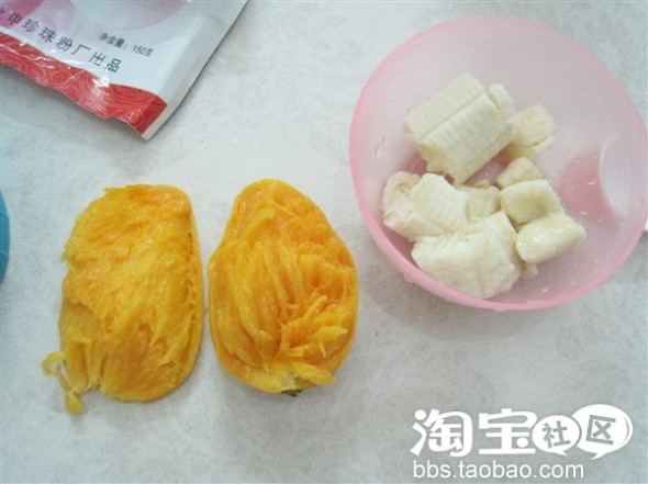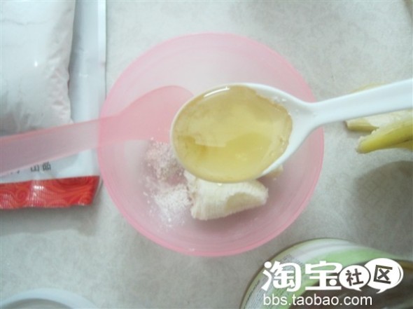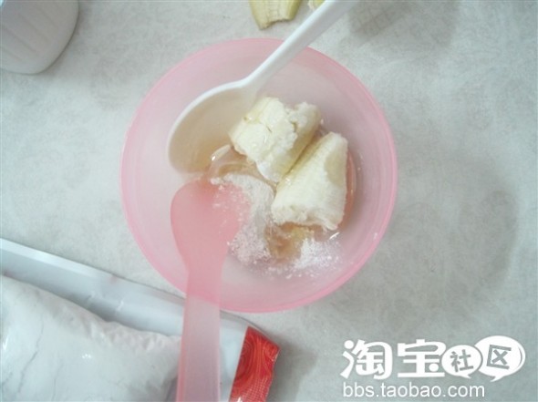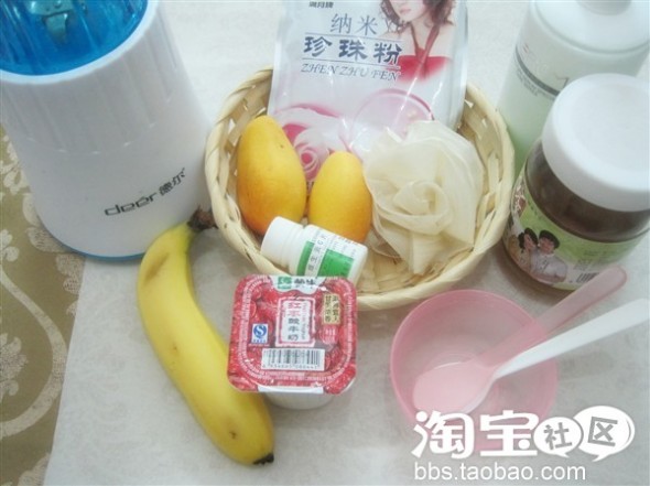 面膜材料:珍珠粉、蜂蜜、香蕉、VC、水。