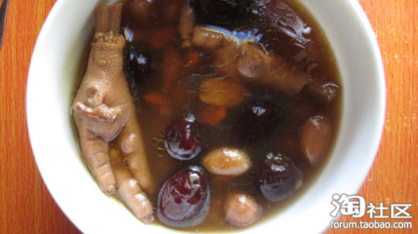 这个鸡爪做法很简单,先把鸡爪的指甲去掉,在热水你烫过就可以放进锅里炖了哈,好看颜色这么深都是顿出来的,就只加了点酒和盐就可以了!!常吃胸部怎能不UP呢!!