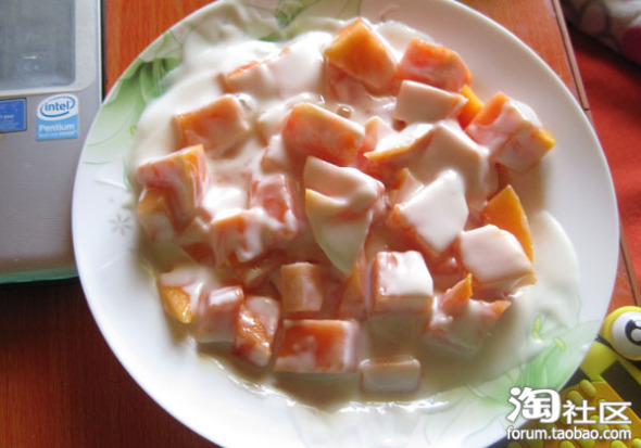 第三:木瓜牛奶,木瓜切成小块到入酸奶,绝对美味了!男朋友知道我喜欢吃,会很用心的把皮,籽去干净(我老爱你了)
