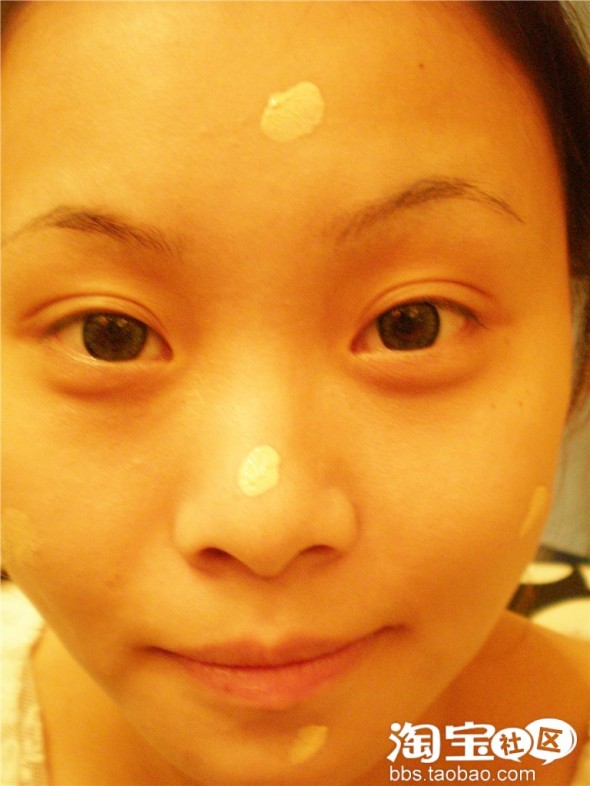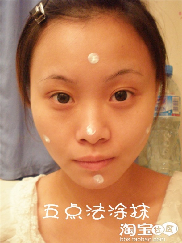 还是老方法。涂抹5点。然后用指腹轻轻涂抹开就可以。很多MM都喜欢拍这样是不正确的。
