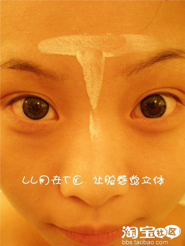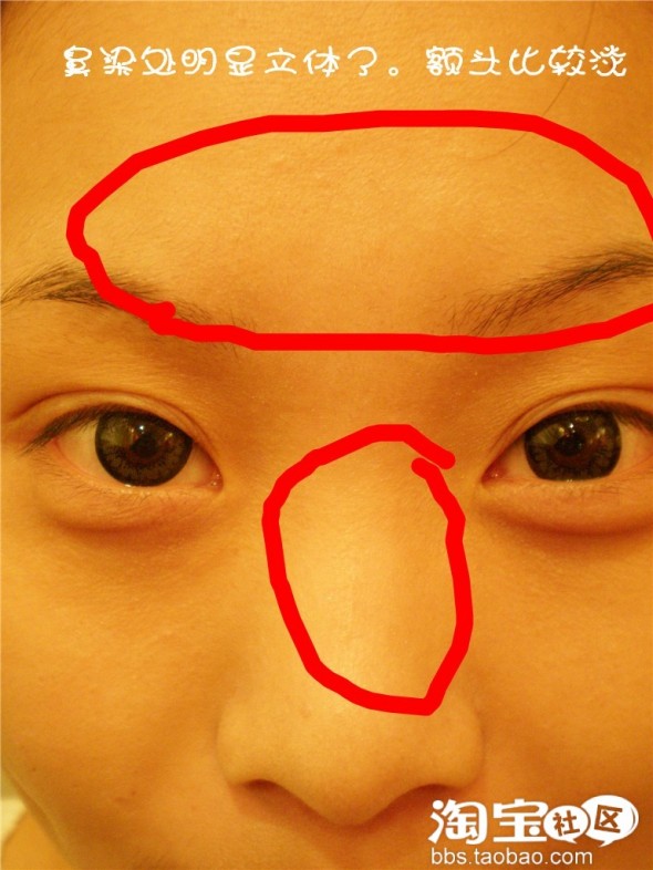 因为LL的额头比较扁平。鼻梁处不太立体。所以会在这里重点打高光!
