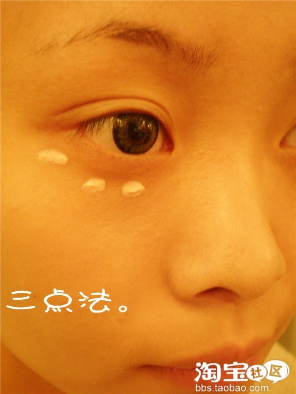 取完量后,按黑眼圈的范围进行涂抹 用无名指(美容指来推开就可以)