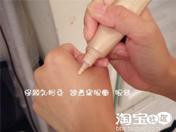LL是最重视眼睛的。所以从眼睛先下手,先用眼部遮瑕的修乳。 是粉色系的。