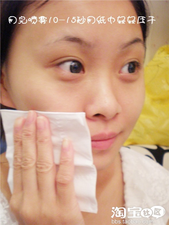 那么我们就要用纸巾轻轻将喷雾预留的部分按压干。这样皮肤会感觉软软的。也很利于上妆