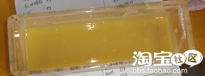 ⑥:等待两个的温度都为45度是 将NAOH缓缓的倒入油中,快速搅拌 此步骤最为费时 要不停搅拌一个小时 使其变的粘稠 可以在皂面上画一个“8”字 测试下。