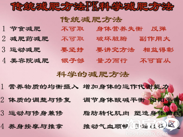 强烈反对:单一节食,(身体供给拉断,极易反弹)单一强力运动,(超负荷,更易形成肌肉)单一美容院瘦身(如针灸,推脂,等)严重抵制减肥药,(伤五脏,破坏身体健康)