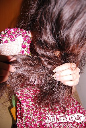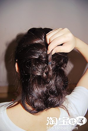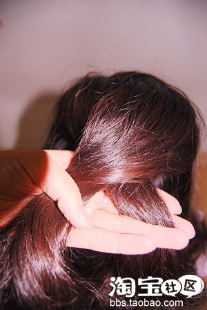 2.从马尾下方分出一缕头发逆时针方向环绕橡皮筋,将其遮住,然后用夹子固定即可,重点是将后脑勺的头发拉松哦,扁头MM特别要注意!