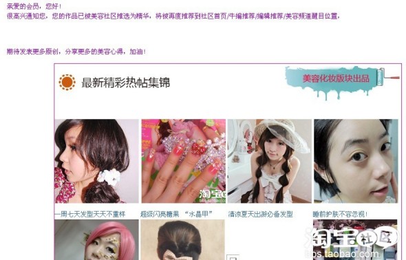 很高兴通知您,您的作品已被美容社区推选为精华,将被再度推荐到社区首页/牛编推荐/编辑推荐/美容频道醒目位置,