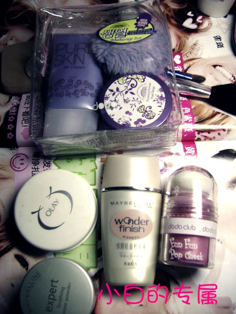 最上面那个DODO套装,效果一般吧,不过比较便宜,上妆速度也快,用了那个BB霜以后就不用再擦粉底了,散粉比较透明。一开始擦上去的时候有点不自然,用粉扑(不是那个紫色的粉扑,是擦粉底的时候用的)把BB霜推匀就好了。