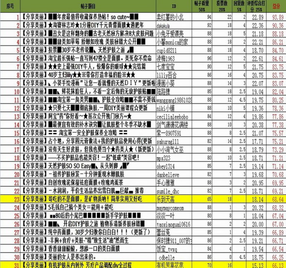 此次评分规则为:帖子质量50%+回复数5%+10位资深评委综合打分25%+投票数20%