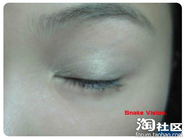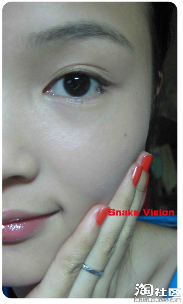 素颜的另外半张脸、呵呵……呃、其实也不能完全算是素颜、至少已经上过粉底了。关于粉底,简单的说一下吧、Snake比较喜欢先在手背上挤出适量的粉底液,所谓适量就是跟平常涂香香的分量差不多,然后用另一只手的食指尖沾取手背上的粉底液,点在额头、鼻梁、两颊、鼻头、人中、下巴……等等地方,然后再用指腹轻轻将粉底液拍匀。Snake 感觉用手拍打的方法能让粉底液跟皮肤之间更服帖,效果比较好。当然,各位亲们也可以根据自己的习惯来,咱们的目的都是一样的,让粉底更服帖、更自然,妆效更好。对吧~哈哈