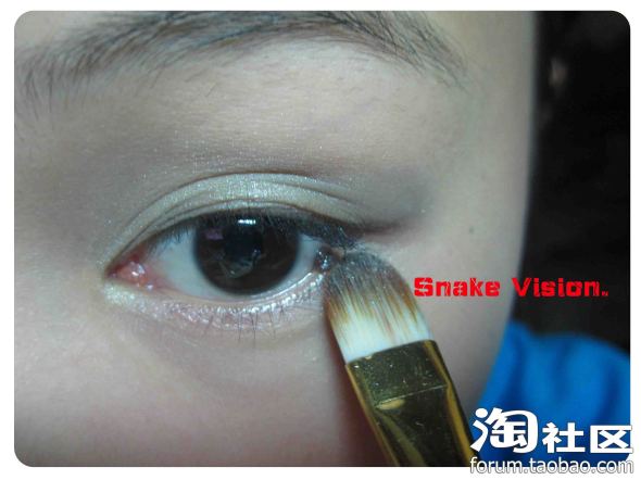 夹好睫毛之后,咱们就开始化眼妆啦、首先,用浅金色珠光眼影打底、涂在眼窝部位、