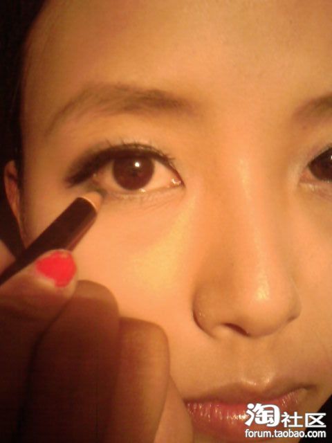 用黑色的眼影从眼尾向眼头涂开,颜色越重越好。