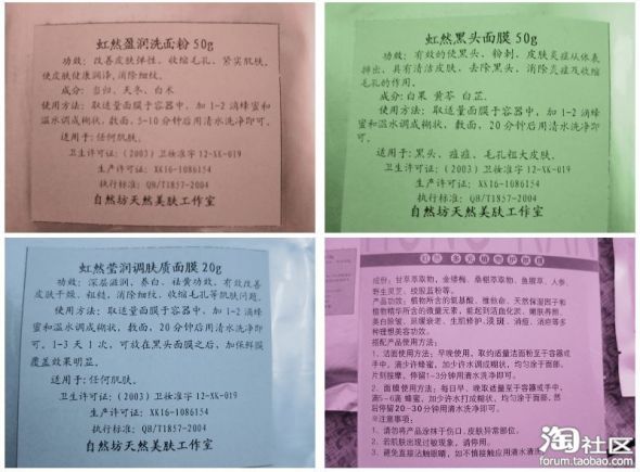 晚上用黑头面膜或调肤质面膜,调制方法和面膜粉相同。黑头面膜颜色是黄色的,是三样里面最难调的,要搅很久才能调到比较适合涂上脸的状态~~~敷15-20分钟,洗掉,我个人觉得比较干,赶快上霜!!!