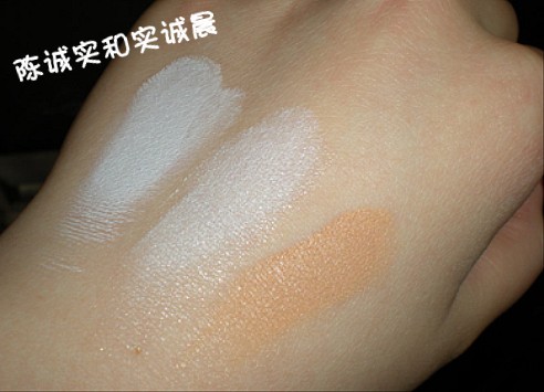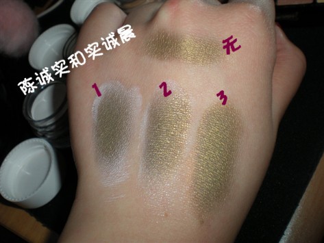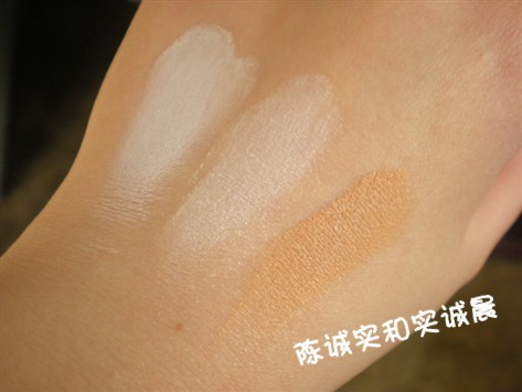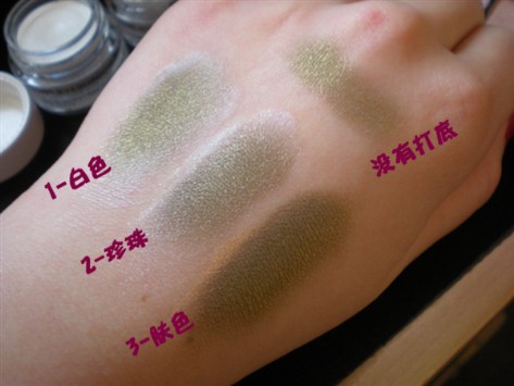 我个人认为,从肉眼直观上看,三个颜色打底后,在上眼影,眼影会很饱和,同时颜色也会有改变,当然我为了照相明显一点,会对涂几次,日常中,打一次绝对够了~~这三个颜色中,肤色的打底效果我个人认为最突出,不知道是不是我本身就喜欢肤色的这个啊。。。。。。这个是膏状的,我觉得还比较好推,要是眼皮比较干的姐妹们还是要慎重选择,先到这里吧,看来试色的帖子也是一体力活~~期待陈诚实下次的试色吧~~