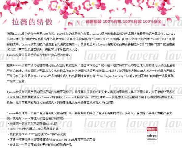 德国lavera拉薇全球第一有机化妆品牌,以生产100%天然有机植物成分的化妆品享誉业界。100%有机100%有效100%安全不是拉薇的广告词,而是众多检测机构多年对lavera产品的检测结果。