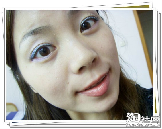 这张是用浅紫色的从眼头开始画,画到跟蓝色眼影交接的地方,然后上面的眼皮也画一点,呵呵,言辞错乱,看图片就知道了