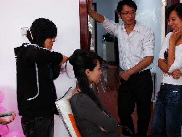专门请的化妆师来我家,化妆ING,旁边还俩欣赏的,偶老公和俺的好盆友~~