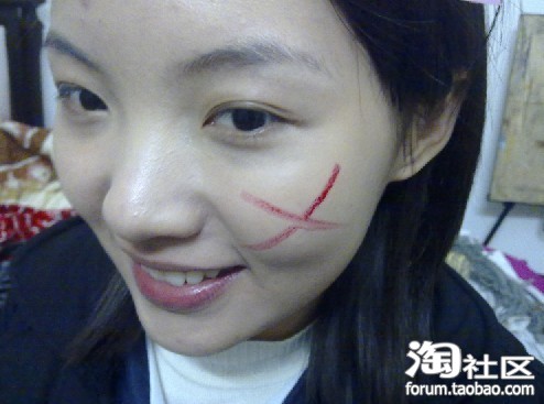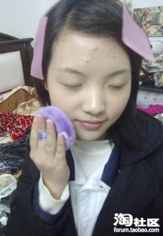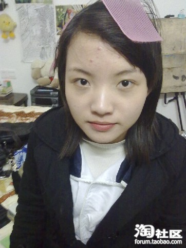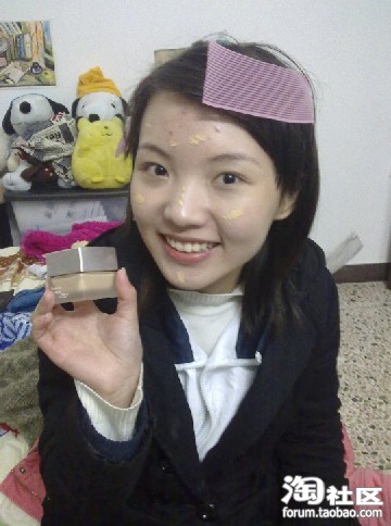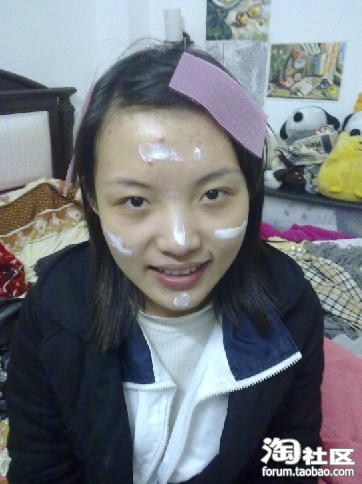 第四步,遮瑕啦.因为她额头上的痘痘都发炎啦,所以尽量不要去遮它,因为模特本身有留比较厚刘海可以遮住哦.遮瑕膏上后,要用手的指腹轻轻拍打.不要用推得/才可以把痘痘遮掉哦.~~