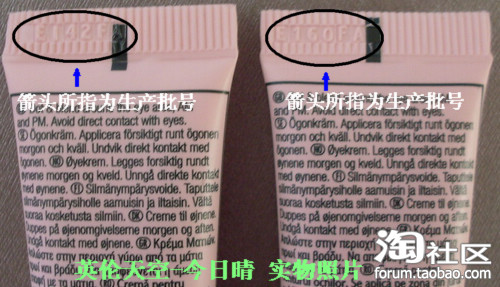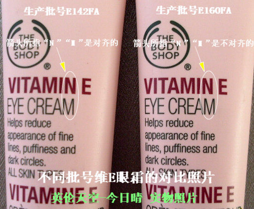 为了求证这种说法的正确与否,我把在伦敦TBS总部进货的几个批次的维E眼霜进行了仔细的比较和辨别。发现这两种情况都存在,只不过生产的批号不同,比如批号为“E142FA”的眼霜,两个英文字母上下就是对齐的;批号为“E160FA”的眼霜,两个英文字母就不是对齐的。这就证明以这种方法鉴别真伪是错误的。