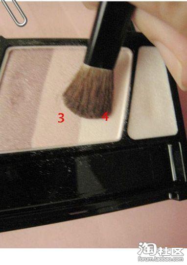 然后是用眼影刷沾取3和4涂抹在双眼皮褶皱处,范围要比褶皱大一些哦~自然晕染就OK闹!