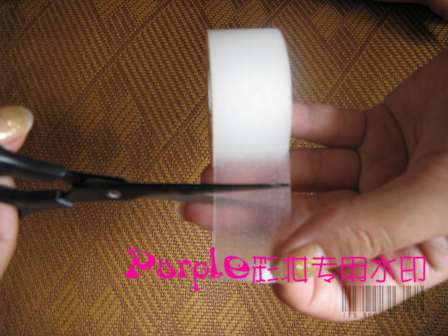 我们用的是双眼皮胶带根据眼睛的曲线大小剪下适合的胶带大小!偶的眼睛的是一个单一个双!今天就是把两只眼睛调到相同的大小!(不会自己减胶带的妞们可以用买来的已经成型的双眼皮胶带来贴哦!)