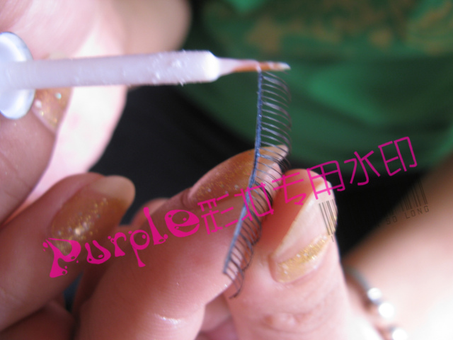 通常很多妞都会先画眼线再粘睫毛!!今天再教给大家一个办法!!先用黑色的眼影代替眼线来画一定要靠近睫毛根部哦!!再来粘睫毛了…我们用的是手工棉线的睫毛戴起来不会硬硬的!靠近眼部的部分是棉线的非常贴合眼部,柔软不会扎眼睛!