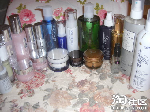 下面的第一个,那时自己长满豆豆,他们都说这个好,就买了是网上买的,后来洗了有红血丝,可能是我的皮肤差了吧,要不就是不适应,但是洗了皮肤是光了很多。寄过来的时候盖子盖不住,时间放久了,感觉就不好了。现在就扔那了。第二个是化妆水。是日本产的,但是网上也找不到,用了好久,现在这个牌子都换新瓶子了。跟水一样没区别,但是价格不便宜。第三个本来也有一套的。是他们从国外给我带的,我去网上查了也没这个牌子,所以我也不知道,现在用了只剩下这两样了。下面的是超市买的,为了出远门方便带,就买了。现在都扔那不要用。最后一个小瓶我也不知道什么牌子,眼霜啊。感觉没效果。