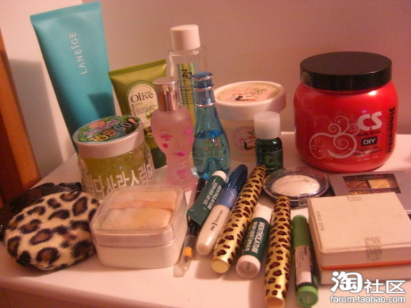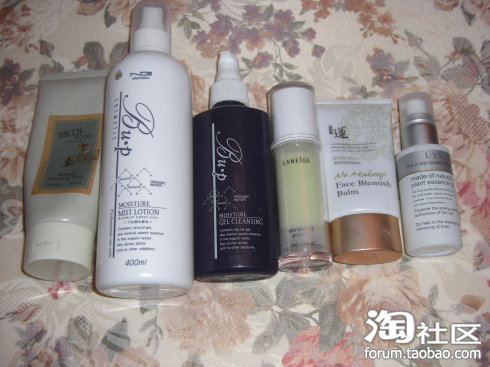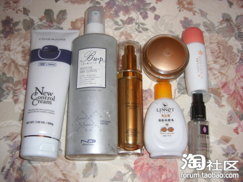 第一是SKIN FOOD,用了差不多了,没见很好的效果呢。两外两个都是上面的牌子,是美容院买的,价格是高的。用用也就那样了。第四个是隔离霜,兰芝的,我觉得不错的。很水的,涂上去很自然。第5个是BB霜,上面写着莲的也不错。韩国货,最近再去那家美容店买,哇价格又高了,看网上这么便宜,想着效果会不会不一样,还是想着去店里买,最后个是卸装油。那个老板娘介绍说LYS,其实我是不懂的,我的脸属于油性皮肤,一下子就没了。郁闷,被骗了。