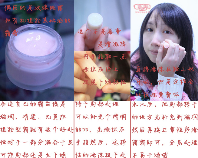 开始用选择的植物型霜时,先涂抹1-2层来找到适合最大面积的滋润度(清透不干燥)。然后下次就可以在使用霜前,在局部特干部位加一点调节和增润的东东(非常非常轻微的干燥差异,直接在下一次使用时局部多补充一点自己的霜就可以了),然后再用霜。