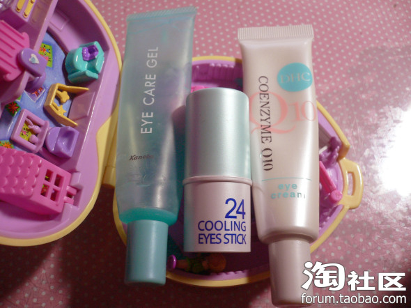 右边的是dhc的眼霜~改善细纹的~质地有点像黄油的质地,不油很清爽,里面含有q10成分,不错~
