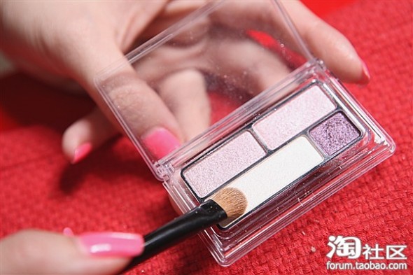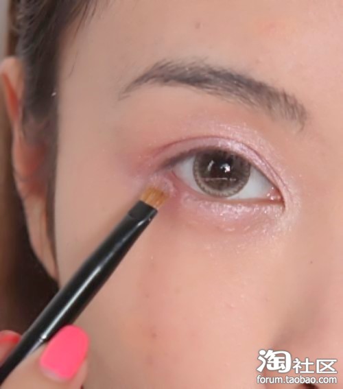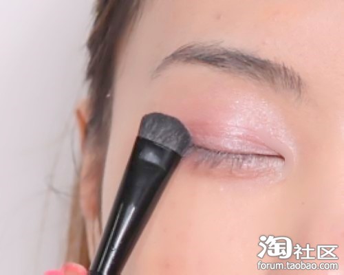 第三步:在眼窝的位置图上浅粉红色的眼影,之前用的眼影扫可换成短扫,这样出来的颜色会厚实细致一些。