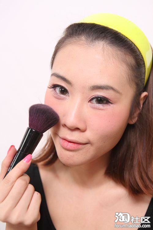 第十四步:胭脂——今年春夏妆容的特色是可爱,所涂胭脂的部位为颧骨在高一点,眼睛下面。涂得方法是正面照镜子,将胭脂扫竖着打横涂一直拉伸到鼻子两侧的地方。谨记挑选胭脂的颜色要尽量选粉红的哦!