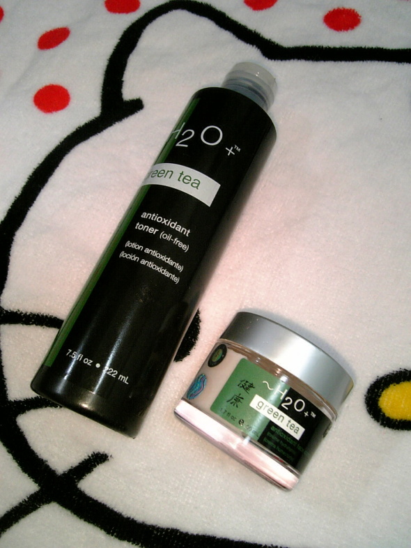 第一步。上爽肤水。乳液。等等。。。我用的是H2O的绿茶系列、据说是有去黄的效果。