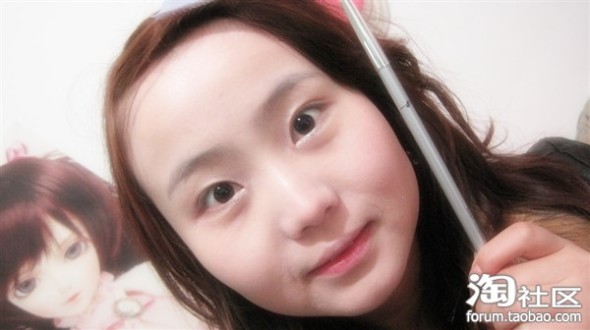 我妹比较偷工减料,自己画,我在一边拍照,所以我没代劳,眼线画法我唠叨下:用眼线笔化时一定要从睫毛跟部化起,假如闲麻烦,可以用点的,把它连成一条线一定要整齐利索,否则看起来不流