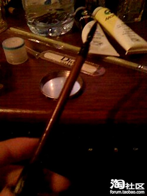 接着先挤出些黑色的颜料,用红色的画笔在自己指甲上吐沫均匀