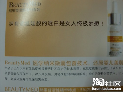 BeautyMed 熊果苷活性美白系列的特点是根据医学配方采用高科技微脂囊包覆技术,利用最有效的5%浓度熊果苷活性微分子稳定穿透角质层靶向深入基底层,最高效分解肌肤深层黑色素,同时从源头抑制黑色素的沉淀,到达持久美白,医学自然疗法为肌肤提供最安全的,透亮美白效果,这种白不是白苍白无光,而是欧洲人所追求的那种自然、健康肌肤所表现出的透亮美白,宛如肌肤初生般光泽纯净的白。
