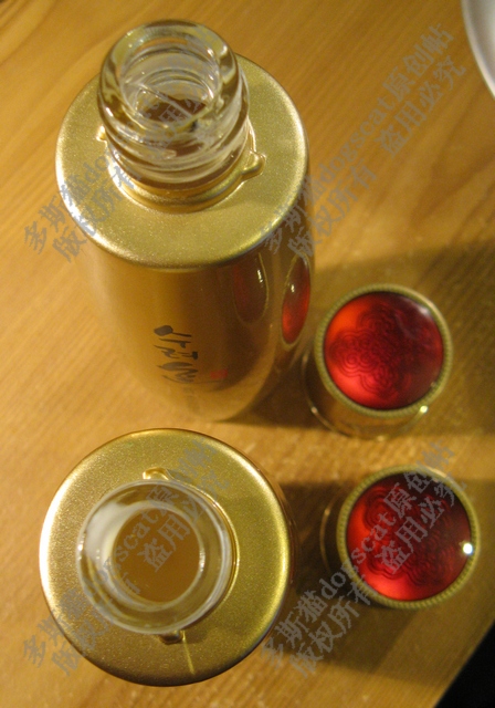 台湾的人气综艺节目《女人我最大》是多斯猫每天必看的节目之一,里面经常介绍到所谓“高机能”化妆水,营养和保湿成分都高于一般的化妆水,质地也是比普通化妆水粘稠的啫喱状,而这里所介绍的润河超保湿水液正是这种啫喱状的高机能化妆水。这里所说的“啫喱状”,其实并不是我们平常俗称为“啫喱”的果冻状,而更像“吸C”的水啫喱。旋开水液瓶子的外盖后,里面还有两层塞子,一层是密封的防漏塞,另一层是用于平常控制倒出量的塞子。密封塞子已经拨出虽然能塞回去,但是周围的连接处已经断裂,基本可以扔掉。只是这啫喱状的化妆水也太粘稠了,多斯猫化了九牛二虎之力拼命上下摇晃瓶子,才倒出了几滴化妆水。没办法,一不做二不休,只能把剩下的一个塞子也拔掉,否则以这样的速度倒化妆水,早上是一定要迟到的。