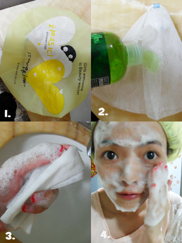2.--3。把洗面奶倒在打泡网上(打泡网可以打出细致,均匀的泡抹,只要一点洗面奶就可以产生泡泡)