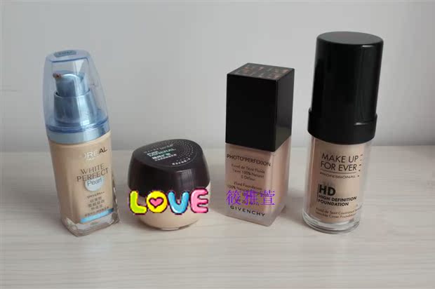 欧莱雅雪颜珍白粉底液,美宝莲精纯矿物粉底霜,纪梵希感光皙颜粉底液,浮生若梦HD高清晰无痕粉底液。最爱纪梵希的那个,是那种用完了还会想再买的粉底, 特别的细,超好推的,持久遮盖功力OK。